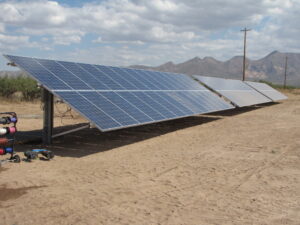 In many solar pumping installations, panels are wired in series to create a string. When panels are wired this way, their voltages add together while the current stays the same. For example, ten 40 volt panels wired in series create a string that produces roughly 400 volts.